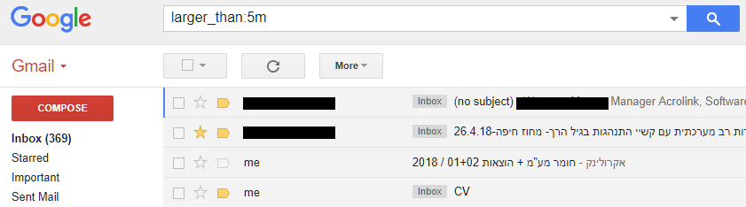 די קל למצוא את ההודעות שתופסות שטח אחסון גדול. לאחר סינון הודעות אלה, סמן אותן ומחק אותן. למשל, למציאת הודעות מייל גם גודל שווה ל- או גדול מ- 5MB, הכנס לשדה החיפוש את הביטוי: